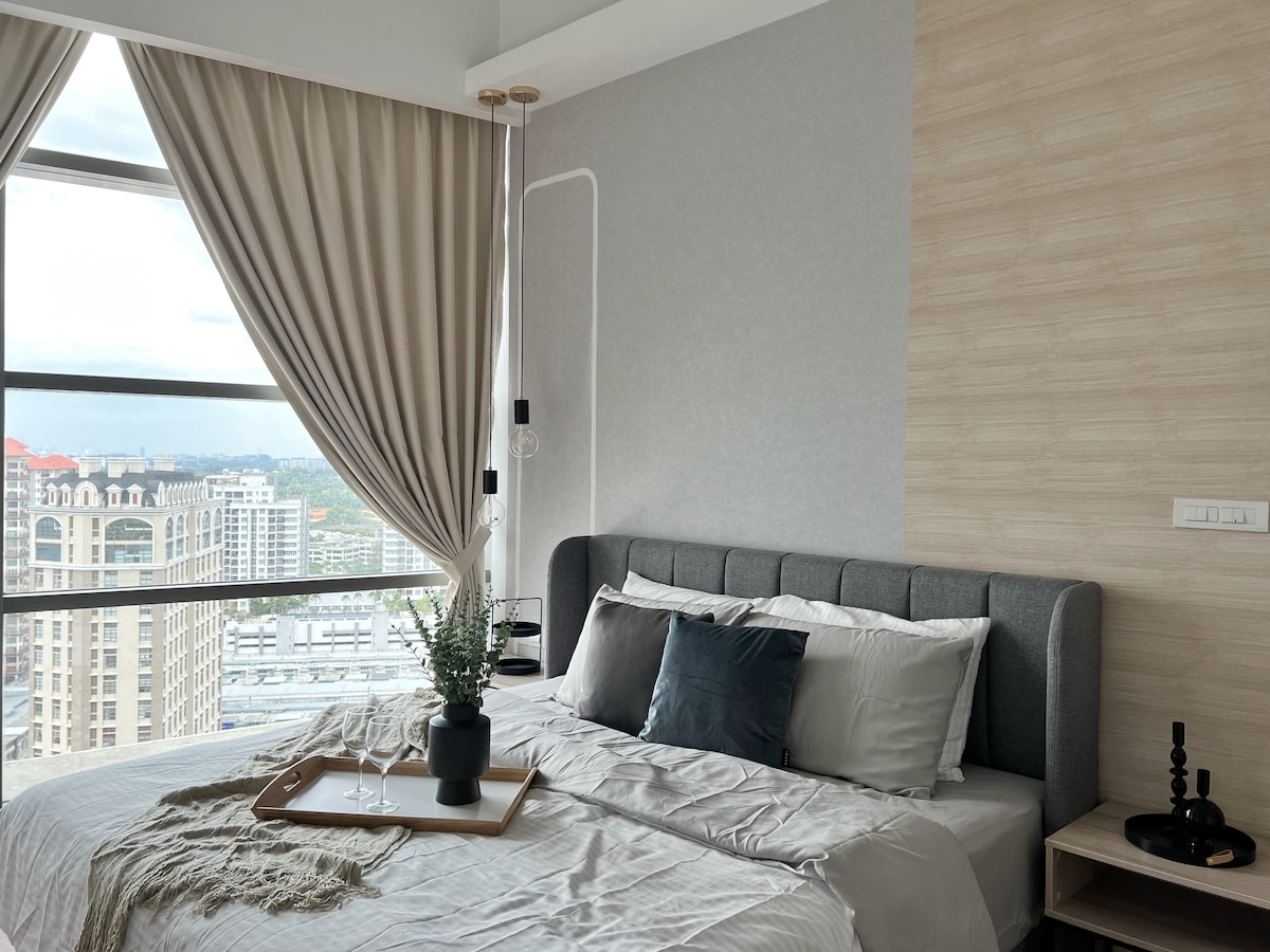 LEBE . SCHÖNES LEBEN in INSPIRIERTEN HÄUSERN! Saubere und desinfizierte Wohnung, bleib sicher! Panoramablick-Eckstudio-Apartment mit gemütlichem Rückzugsort. Im 7. Stock mit Queensize-Bett, 40-Zoll-Smart-TV mit Netflix-Zugang, Wasserkocher, Kühlschrank und Küchenzeile mit Grundausstattung. Wohnen in einer Wohnung mit hoher Sicherheitsüberwachung und eigenem Parkplatz. Ausgestattet mit Swimmingpool, Fitnessraum und Spielplatz. Willkommen Einzelperson/Paar/Geschäftsreisende für Geschäftsreise und Urlaub!