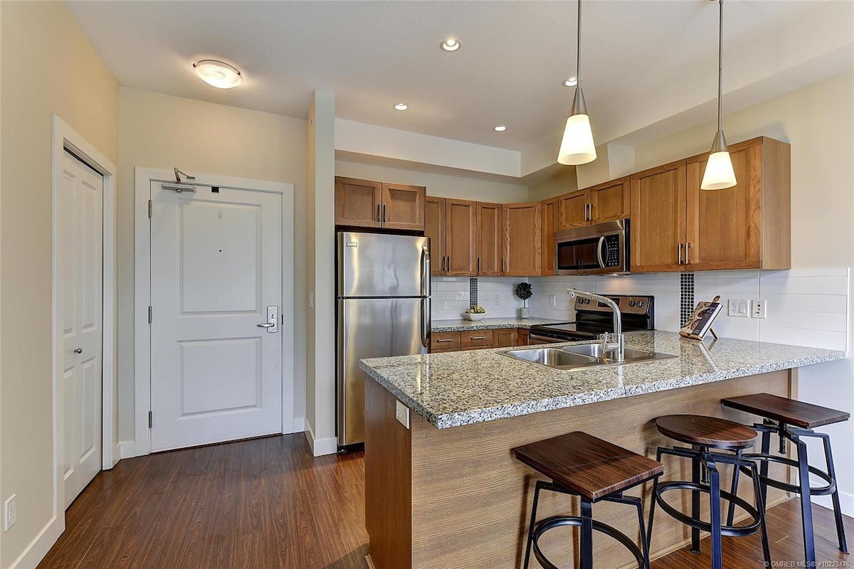 NO Cleaning Fee! Enjoy this bright 2-bed/2-bath condo in the heart of Kelowna. Sleeps 6 with a king, queen, and queen sofa-bed. Cook in a full kitchen, relax by the gas fireplace, stream Netflix on the large TV, or sip morning coffee on the balcony. A very walkable neighbourhood with nearby parks, beaches, wineries, breweries, shops, and restaurants. Free self check-in, secure parking, in-suite laundry, central heat/air, and high-speed WiFi. 2 pools with hot tubs, one open year round!