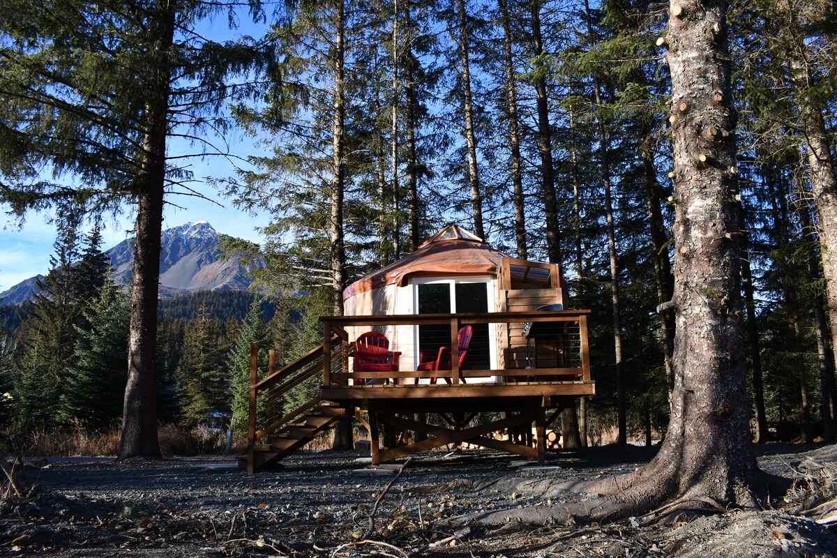 Private, peaceful and in town! Spoil yourself at Alpenglow retreat as you take in the "MILLION DOLLAR" views of Kachemak Bay. Surrounded by trees you can have total privacy while you enjoy the spectacular views. The 16' yurt comes with separate full bath. The yurt has a queen bed and mini kitchen. It's ideal for people who love the outdoors, but appreciate cozy nights inside, and comforts of a private, complete bathhouse.