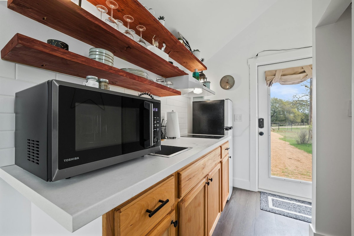 Welcome to North Star Nook, a pet-friendly, one-story sanctuary on Twilight Ranch, just 30 minutes from downtown Fredericksburg. Enjoy panoramic Hill Country views through large windows, witness local deer, and revel in the cozy privacy of this serene retreat. Say hi to our resident Llama, goats, and horse! Queen bed, TV, cozy bath w/shower, and kitchenette w/ rustic charm, modern comforts, & an on-site steward, Amy, North Star Nook offers a seamless escape to the beauty of the Hill Country.