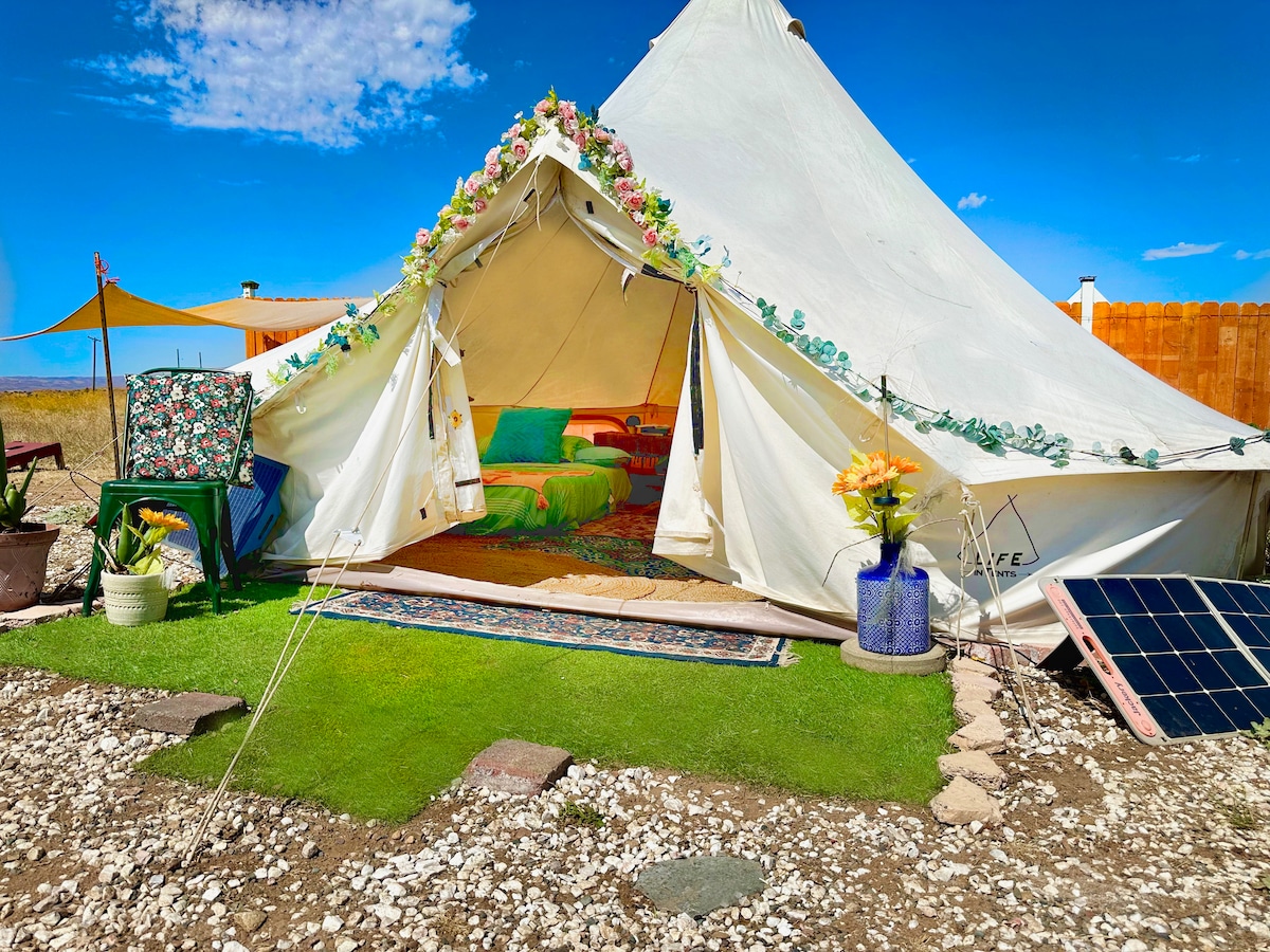 Willkommen! Wir sind Cuyama Oaks Ranch. Wir sind einelgbtqia + geführte Ranch. Diese Glampsite (19ftcanvas Jurte) liegt im versteckten Tal des Händlers mit Panoramablick auf die Berge. Dieser Bereich bietet Gästen einen atemberaubenden Aufenthalt. Ausgestattet mit allen Annehmlichkeiten, die für einen schönen Aufenthalt benötigt werden, einschließlich, aber nicht beschränkt auf Solargeneratoren, heiße Duschen, Kühlschrank, 2 Qbeds und mehr! Besuche die Schweine und Ziegen und lass deine Seele frei laufen.