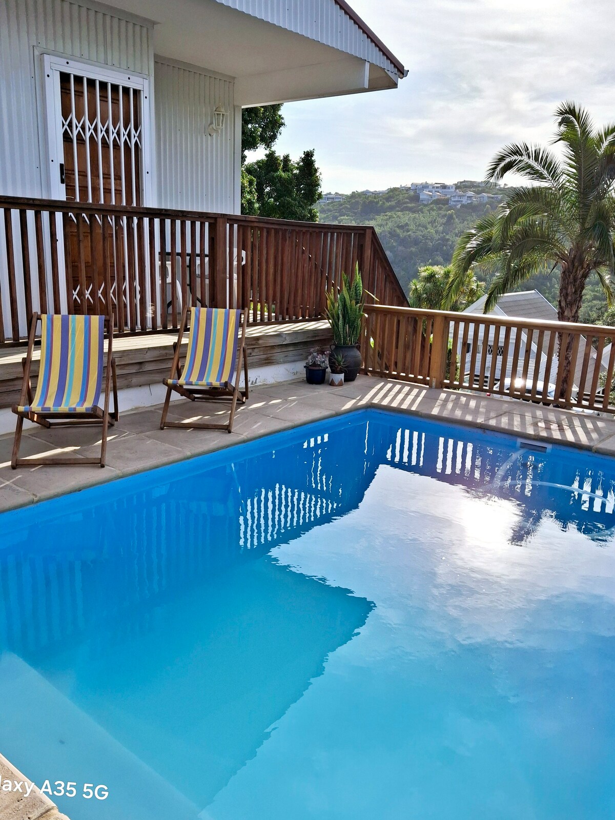 Mit Blick auf den Ozean und die Lagune, eingebettet in ein Vogelschutzgebiet an einem bewaldeten Hügel und 5 Fahrminuten von unberührten Stränden und dem Zentrum von Wilderness entfernt, bietet dieses stilvolle Selbstversorgerhaus geräumige Wohn- und Essbereiche, eine Terrasse mit einem beheizten Pool, 3 Schlafzimmer mit eigenem Bad und private Terrassen mit Blick auf das Meer und den Wald. Zu den Annehmlichkeiten gehören ein Heimfitnessstudio, Pilates-Geräte, ein Weber-Grill, ein 75-Zoll-Smart-TV, DSTV, eine PlayStation 4, ein Tischfußballtisch und unbegrenztes WLAN.