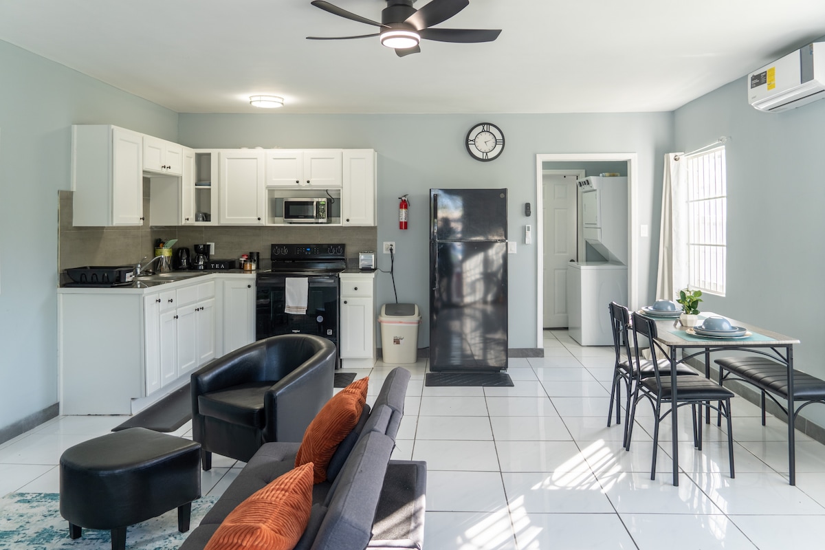 Welcome to Industrial Suites, where modern and affordable comfort meets island life. Enjoy a stylish, spacious 1-bedroom, 1 bathroom newly built apartment complex designed for travelers who crave something centrally located. We also provide Car Rentals for your stay: Please feel free to inquire for more Information on car rental! Each suite comes with a full kitchen, fast WiFi, air conditioning, in unit washer and dryer and cozy living space perfect for relaxing after a day of exploring.