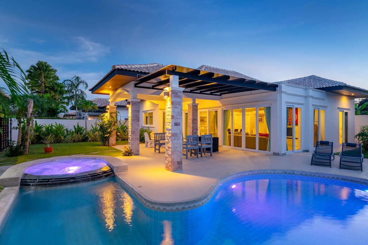 这是一栋令人惊艳的花园泳池别墅,所有的一切都是崭新且现代化的。别墅位于HuaHin114巷,非常靠近市中心。这里是一个社区型别墅,并有24小时门卫值班。400米内有711,cj超市,和当地人菜市场。开车到两个大型购物中心Blueport和Market vliiage 只需要3-5分钟。开车5分钟分别可以到达著名的华欣夜市和周末蝉夜市,Grab和Bolt打车都十分的方便快捷。别墅内设施齐全,客厅拥有200度广角的整面超大落地门窗,75寸超大智能电视,包含Netflix等项目,超大组合沙发,适合多人一起观看和休息。干净宽敞的现代化厨房拥有完善的设备可以制作美食,双开门智能冰箱能满足度假期间所有食物的储存需求。三个宽敞明亮的大卧室,其中两个卧室是全落地门窗的泳池景观,所有卧室都设置了遮光窗帘,床品均为120支贡缎全棉,柔软舒适,可以拥有完美的睡眠,我们还有很多方便带婴儿和低龄儿童家庭的设施,例如:婴儿床,儿童餐椅,脚踏凳,以及儿童马桶垫。花园内有4*9米的超大私人泳池,全套户外餐桌椅和遮阳伞,两把太阳椅,烧烤设备和吸烟区。我相信在这里或让您度过一个难忘且美好的假期。我们期待您的到来!