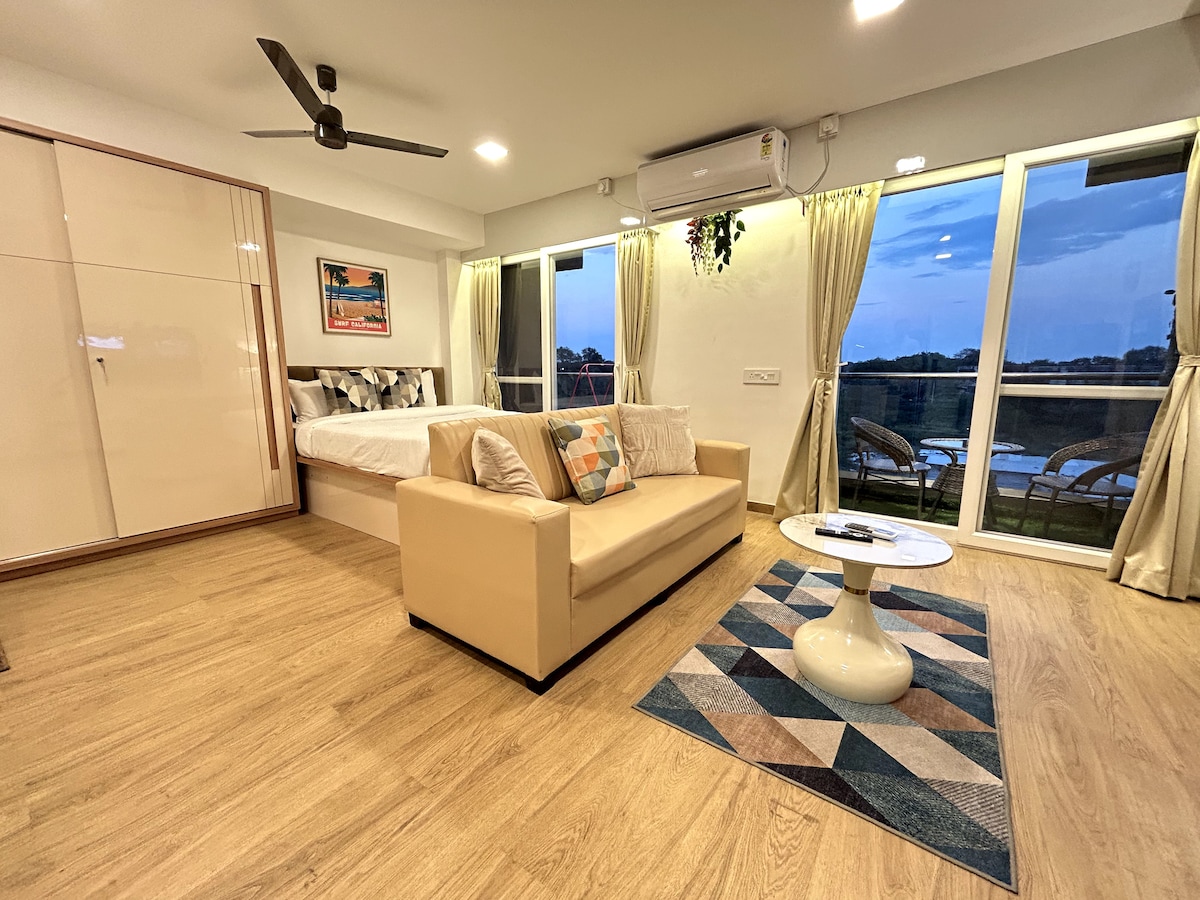 Erleben Sie raffinierten Komfort in diesem geräumigen Studio, nur 2 Minuten vom Flughafen Pune entfernt, in der Premium-Viman-Nagar-Gegend. Genießen Sie die atemberaubende Aussicht vom Infinity-Pool auf dem Dach oder entspannen Sie sich auf Ihrem privaten Balkon mit direktem Blick auf die Start- und Landebahn und beobachten Sie, wie die Flugzeuge starten und landen. Die Unterkunft verfügt über ein gemütliches Bett, einen Smart-TV, Highspeed-WLAN, eine gut ausgestattete Küchenzeile, einen Kinderspielbereich, einen sicheren Zugang, einen Aufzug und einen nahtlosen Self-Check-in für einen wirklich gehobenen Aufenthalt.