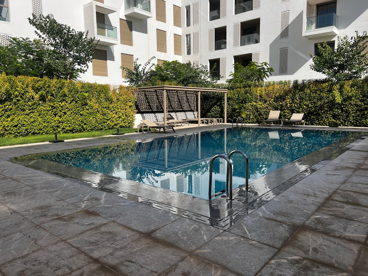 Elegant and comfortable apartment in the premium Orangeraie district of Rabat. Luminous living room with an open equipped kitchen and a quality sofa bed. The bedroom is quiet and offers a comfortable night’s rest. Enjoy a large terrace facing the main avenue and a second balcony overlooking the residence pool. Private Gym is available in ground floor. Cafés, grocery stores, Malls and Dar Es Salam Market nearby. Royal Golf Dar Essalam is 10 minutes away. Perfect for short or medium stays.