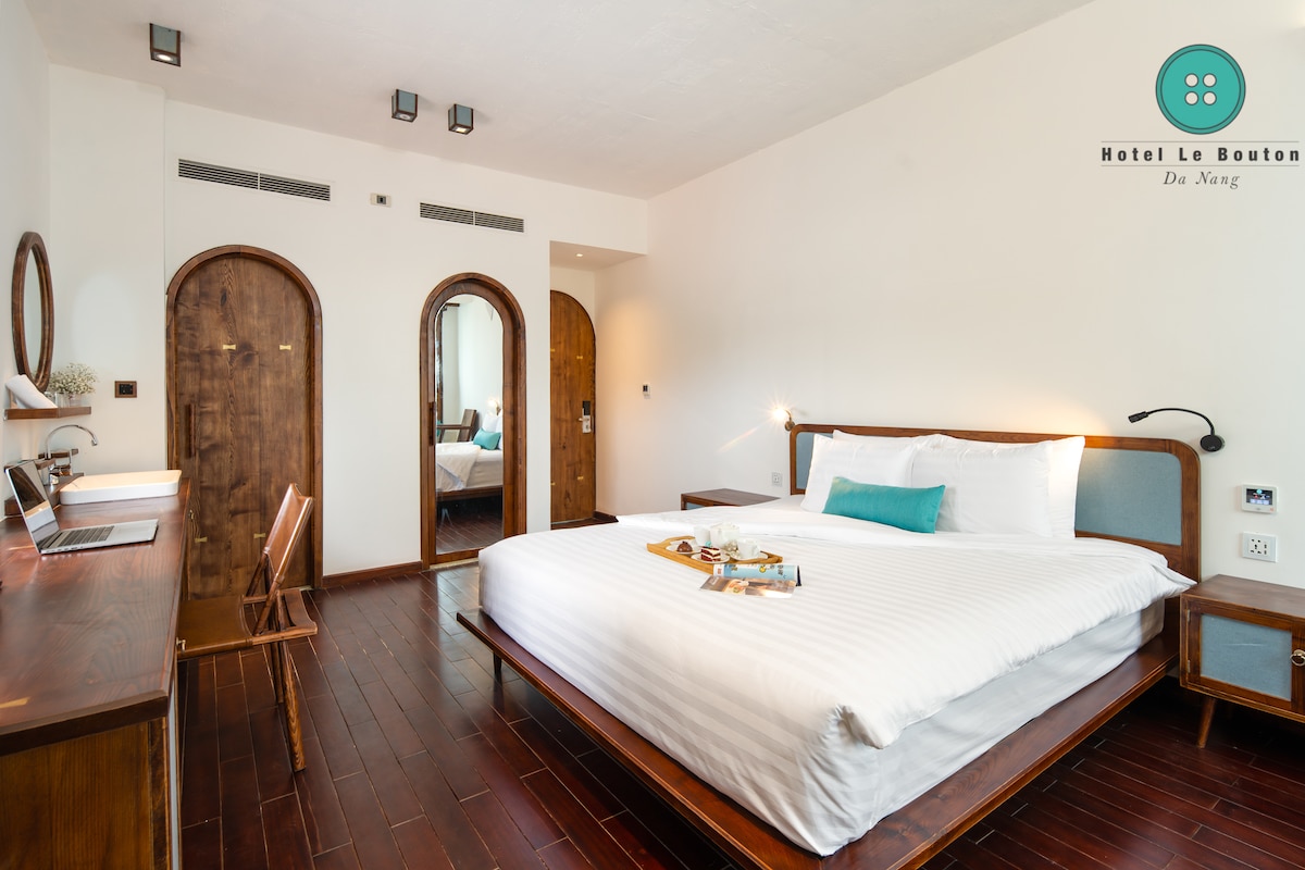 This well-designed room features a small window with indoor greenery and warm wooden interiors. The room offers two bathrooms (one walk-in shower and one bathtub) and can accommodate an extra bed upon request for an additional charge. Located on the 2nd and 3rd floors, the room is accessible by stairs only, with staff available to assist with luggage. -Near the My Khe beach, just 5 minutes to walk