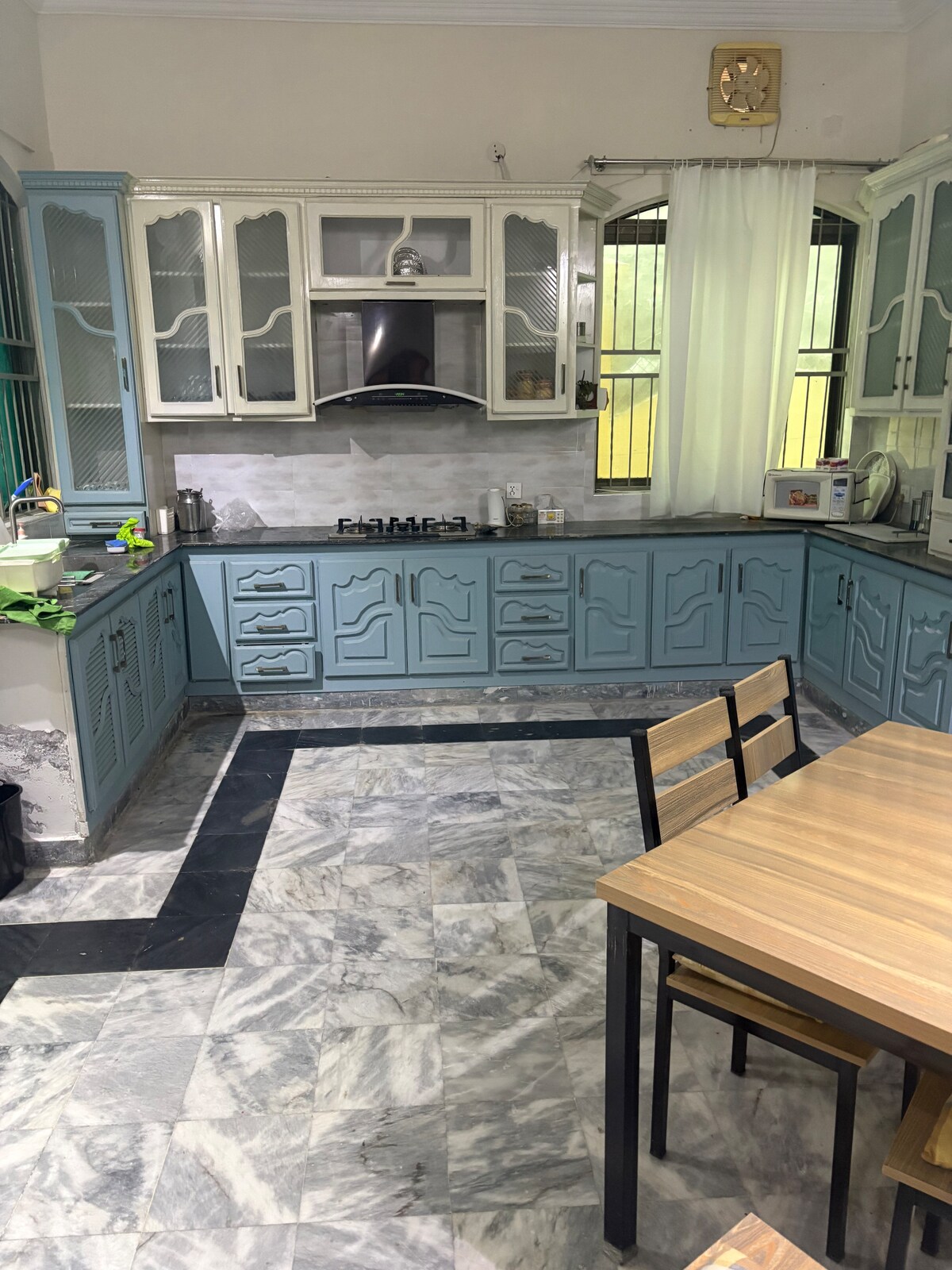 Welcome to Villa 8, a spacious 1-Kanal retreat in the peaceful and secure E-11 sector of Islamabad. Perfect for families and groups, our guesthouse offers stunning Margalla Hills views from the rooftop and a private terrace comfortable 4-seater outdoor table perfect for your morning coffee or evening tea. Relax on our 7-seater sofa with high-speed 100 Mbps WiFi and a large TCL Smart TV in the living room. With an on-site helper for your convenience, Villa 8 is your perfect home away from home.