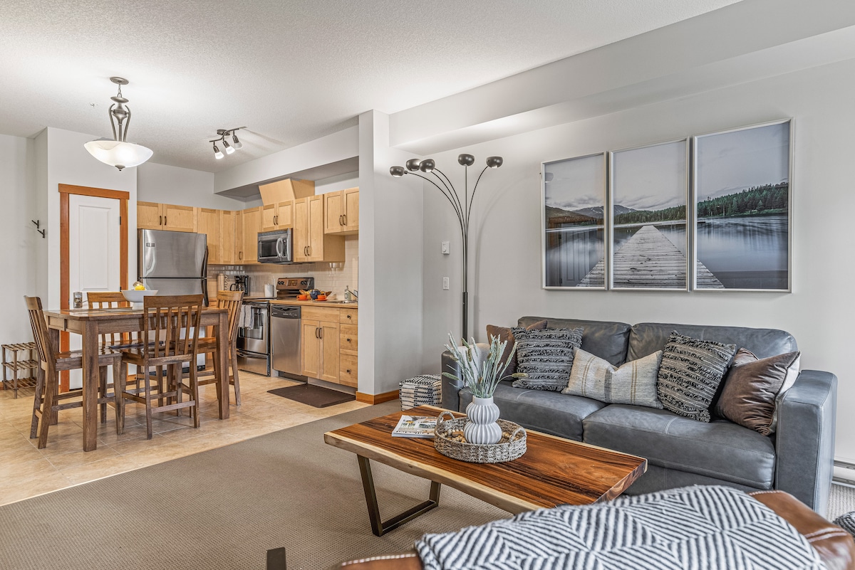 Blue Moose is a newly updated and furnished, spacious luxury one-bedroom condominium with king -sized bed and queen sofa bed. New for 2025: major bathroom and kitchen upgrades. PERFECT LOCATION This modern mountain retreat is situated next to a pristine mountain creek. Follow a creekside nature trail and within minutes you are in downtown Canmore with trendy shops, cafes, food trucks, and both casual and upscale dining.