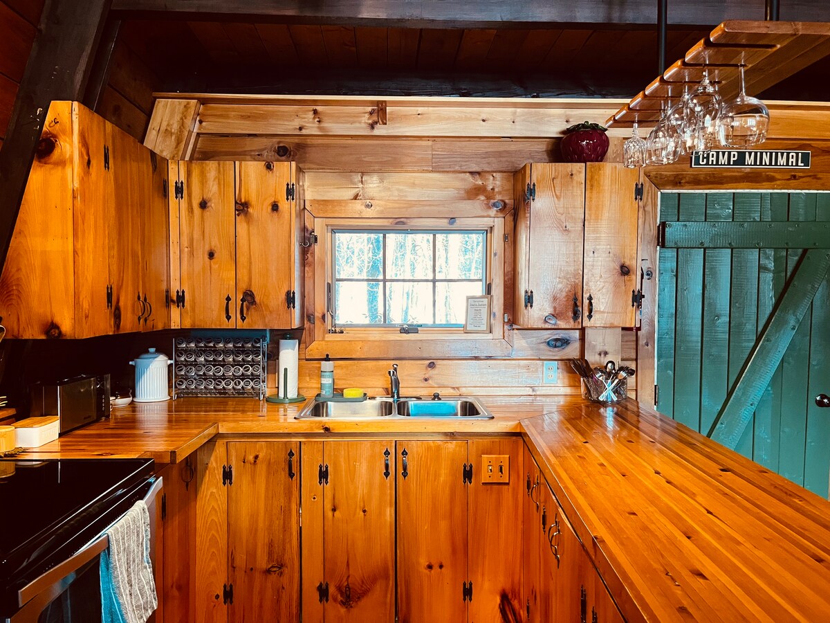 Diese Hütte ist alles andere als gewöhnlich! Eingebettet auf einer offenen Klippe in den Wäldern von Kingfield, Maine, ist dieses architektonische Wunder ein perfekter Kurzurlaub für ein Paar oder eine Gruppe. Es ist ein warmer und gemütlicher Ort, um nach einem langen Tag auf der Piste oder einer Aktivität in jeder Jahreszeit zurückzukehren und sich zu entspannen. Das offene Wohnzimmer und die neu renovierte Küche verfügen über moderne Annehmlichkeiten wie eine Espressomaschine, einen Smart-TV und eine komfortable Einrichtung, damit du dich wie zuhause fühlst. Nur 20 Minuten zum Sugarloaf Mountain!