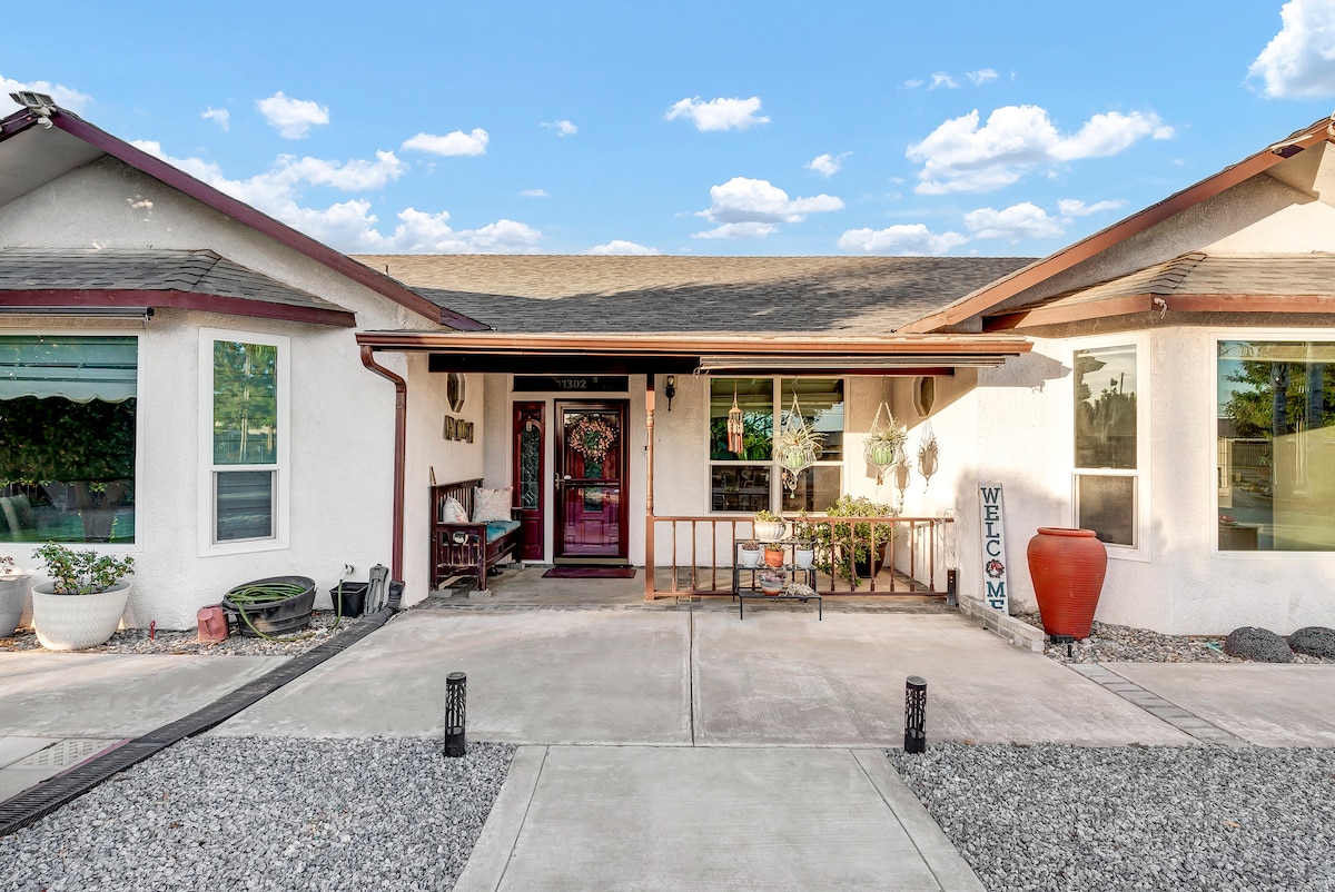 Diese große Unterkunft befindet sich in Hanford (in der Nähe von Visalia, Fresno und mehr als 1 Stunde von Sequoias und Kings Canyon National Park entfernt). Dieses Haus verfügt über eine Einfahrt mit 3 Autos und 4 Schlafzimmern und 2 Bädern. Das geräumige Hauptschlafzimmer/das Schlafzimmer des Eigentümers verfügt über ein kalifornisches Kingsize-Bett sowie einen Futon. Ein eigenes Hauptbadezimmer öffnet sich zum Hauptschlafzimmer. Toll, um sich stilvoll und komfortabel zu entspannen.
