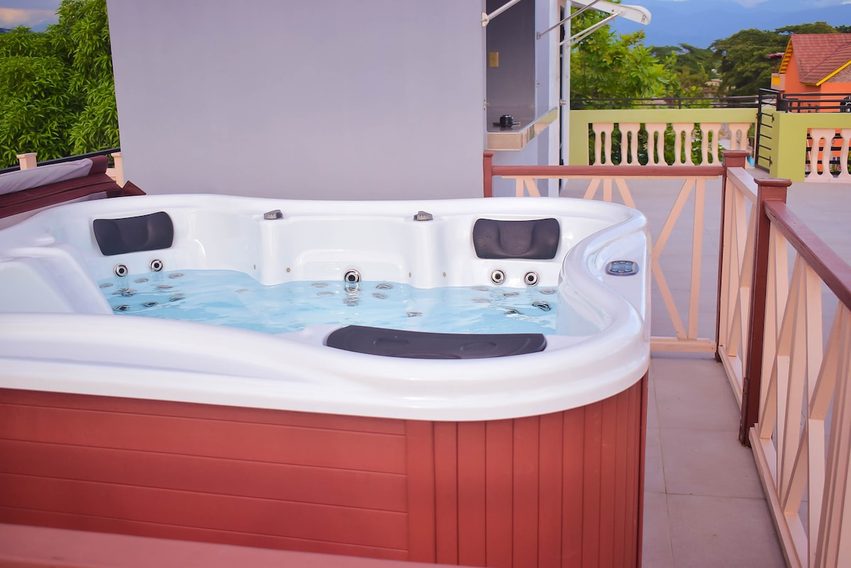 Immerse in luxury in our 2-bedroom, 2-bath upstairs apartment in Caribbean Estate. It features a spacious Mega master bedroom, a 70-inch TV, a relaxing jacuzzi, and a large balcony. Complete with a work desk, chair, and cozy couch, this tranquil, gated community blends comfort with elegance, ideal for both relaxation and work.