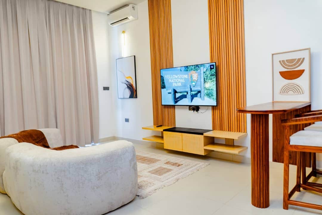 Enjoy a stylish experience at this centrally-located place with modern 1bed apartment in Masaki and stunning sea views. Sip a drink by the pool, train at our gym, your kids get to use the play area, secure access, parking & 24/7 security. Located on Haile Selassie Rd (2nd floor, no sea view) Just 18km from JNIA Airport, 10km to SGR station, 15km to Magufuli Bus Stand & 9km to Zanzibar Ferry Perfect for families or business travelers seeking comfort & convenience in Dar es Salaam.