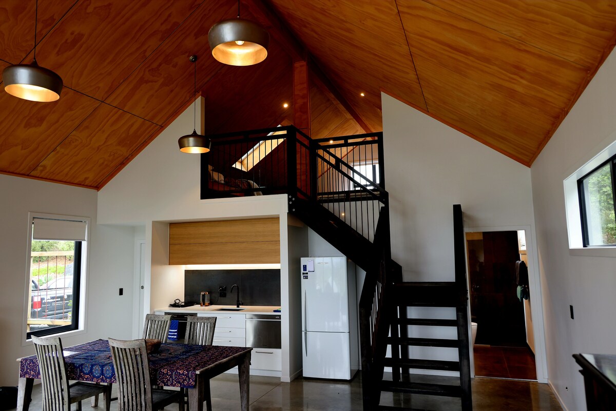 Dieses moderne Gästehaus mit einem 5-Meter-Ständer verfügt über ein großes Schlafzimmer im Zwischengeschoss mit einem Super-Kingsize-Bett und zwei Einzelbetten, einen offenen Wohn-/Ess-/Küchenbereich mit umfangreichen Terrassen und Betonböden. Zu den Einrichtungen gehören ein Spa-Pool, ein Kamin und Innen-/Außen-Essbereiche auf einem 1 Morgen großen Grundstück. 2 Fahrminuten vom Markt, Restaurants und Takeaways entfernt, einschließlich der legendären Mangawhai Tavern. 10–15 Fahrminuten zu deiner Auswahl an weißen Sandstränden und Weltklasse-Golfplätzen.