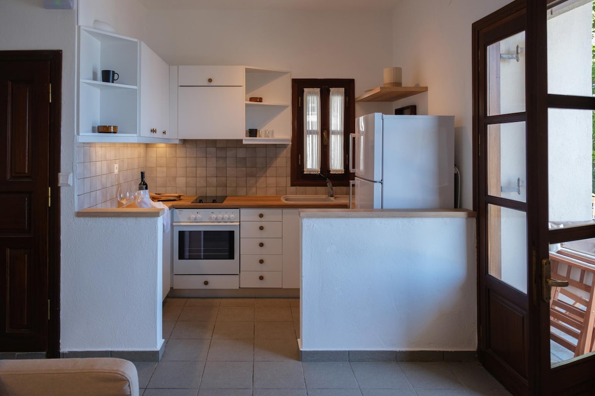 Eine Wohnung im Erdgeschoss eines traditionellen zweistöckigen Hauses. Es hat einen eigenen Garten, mit Grill und Holzofen, sowie einen tollen Berg- und Meerblick. Es verfügt über ein Schlafzimmer und bietet Platz für bis zu 5 Personen. Der Außenbereich, der Hof, die Terrasse und der Grill können von den Gästen im Erdgeschoss genutzt werden. Die einzigen gemeinsam genutzten Räume sind der Parkplatz und die Wäscherei im Schuppen. Das Haus liegt 5' zu Fuß vom Platz Kissos und 15' von den Stränden von Pelion entfernt.