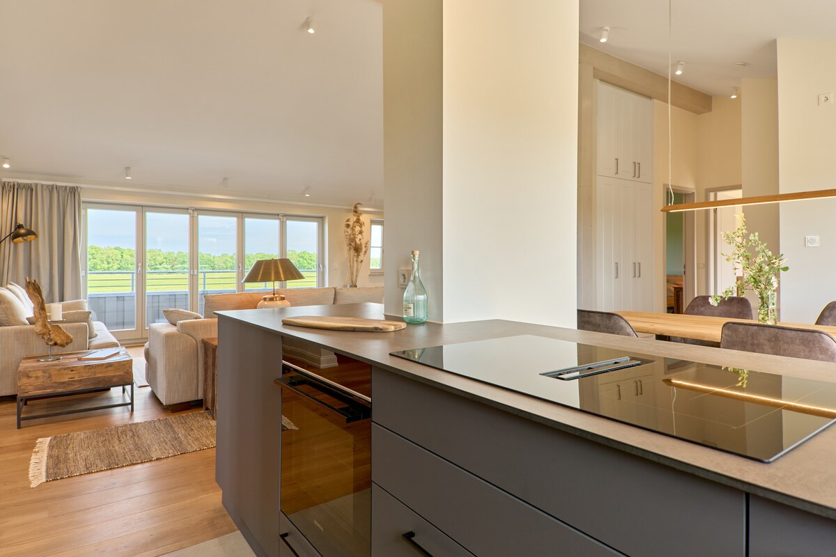Ein Penthouse, zwei Dachterrassen, vier Balkone, der Blick in alle Richtungen, über die Küstenlandschaft Mecklenburgs bis zum Meer, direkt an der Lübecker Bucht, wenige Schritte zum Naturstrand der Ostsee und doch nicht weit die lebendigen Seebäder Travemünde und Timmendorfer Strand. Einfach wohlfühlen. Mit Kamin und Sauna. Espressomaschine und Weinkühlschrank. Alles in einem entspannten Loftdesign. Eine Oase der Ruhe, ein Genuss für die Sinne. Den Sonnenaufgang vergisst Du nie.