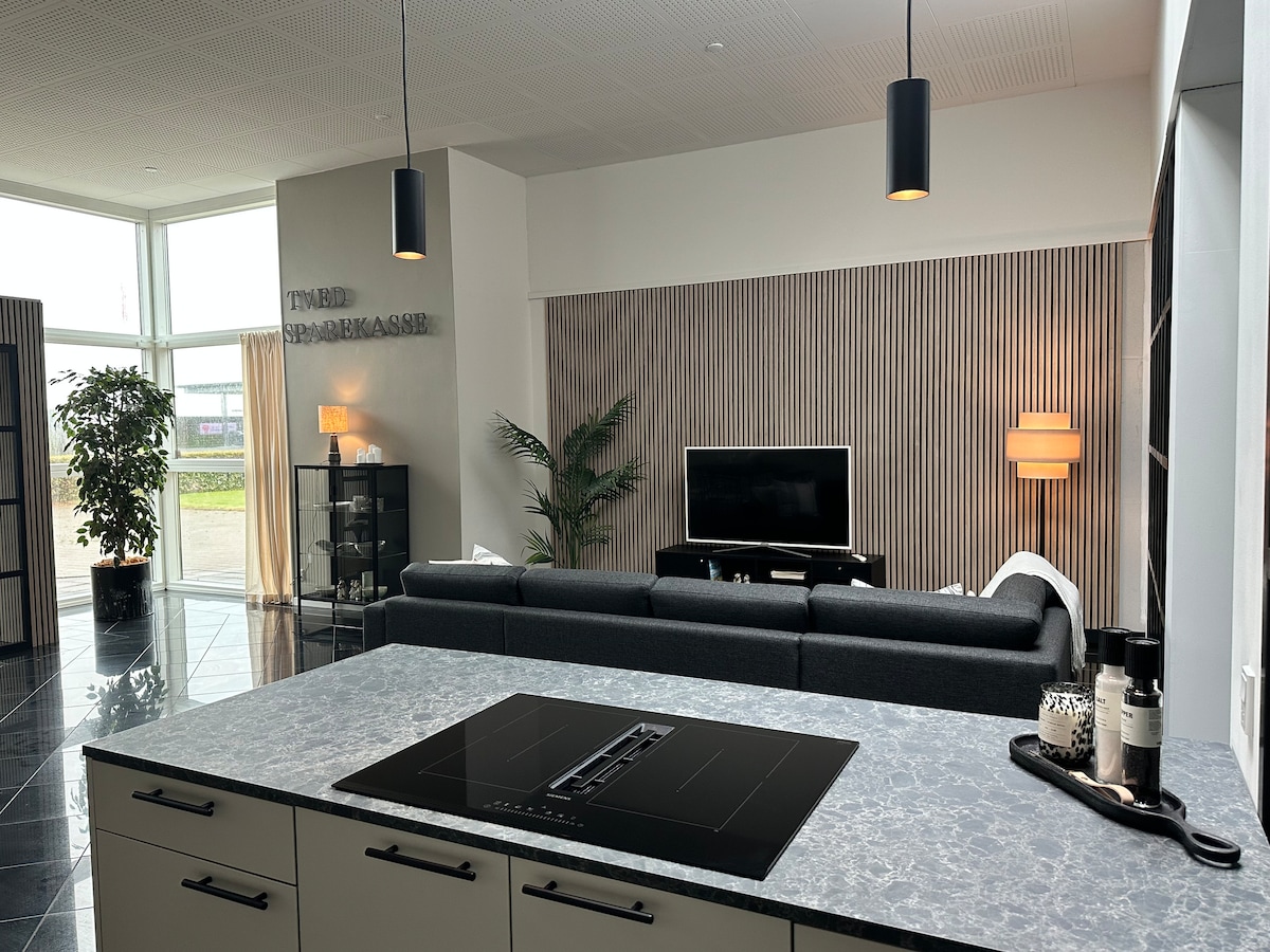 Den gamle bank er omdannet til en stilfuld og familievenlig lejlighed med plads til hele familien. Her kan man samles i det store lyse køkkenalrum eller trække sig tilbage på et af de rummelige værelser. Lejligheden er ideel til storfamilien eller to familier, der er på ferie sammen. Lejligheden rummer også et stort aktivitetsrum med poolbord og bordfodbold, ligesom der også er et legeområde til de mindre børn. Udenfor findes grillfaciliteter og bordbænkesæt og have til børnene at boltre sig i.