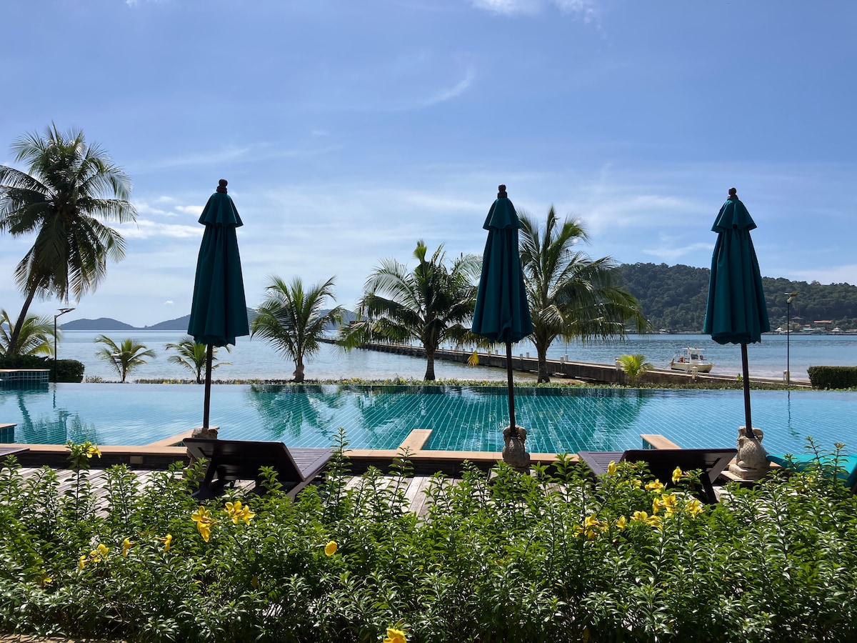 Unaffected by Cambodian border conflict. Enjoy sunsets & sea views. 1 Bedroom, 60 sqm, self-contained apartment with shared 30m pool. 1 hour from Bangkok airport + 1.5 hours door to door minibus/ferry transfer will have you in paradise. Fall in love instantly! Located at Bang Bao fisherman's village. A short walk to Restaurants, bars, beach massage, 7/11 & snorkeling day trips. Scooter past monkeys to inner island walks, supermarket, hospital or stay awhile & explore the smaller outer islands.