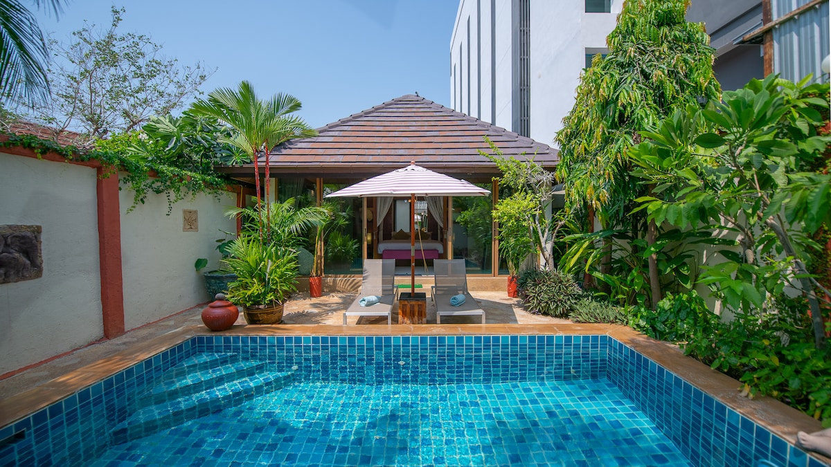 Perfekt gepflegtes und sauberes Dorf, voll klimatisierte private Poolvilla mit einer voll ausgestatteten Küche, SmartTV, Highspeed-WLAN, Essbereich, Gartenmöbeln, Deckenventilatoren, Waschmaschine/Trockner, gleich um die Ecke des Dongtan-Strandes am Pratamnak Soi 5.
