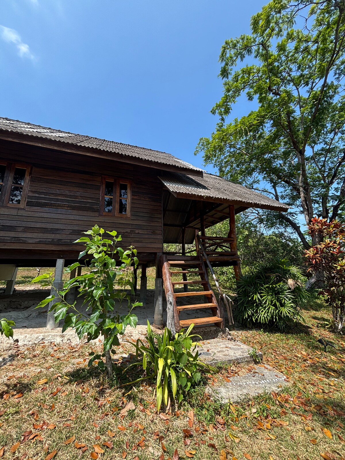 ein bescheidener bungalow im thai-stil aus holz in einem ruhigen garten, mit einer geräumigen terrasse für langsame morgen und ruhige abende. einfach, luftig und umgeben von viel grün. in einer ruhigen Gegend, aber sehr zentral gelegen — nur wenige Gehminuten von Stränden, Cafés und lokalen Restaurants entfernt. Der Bungalow bietet Platz für 1–2 Gäste mit einem Queensize-Bett und ist ventilatorgekühlt (keine Klimaanlage), was zu einer langsameren, natürlicheren Lebensweise einlädt.