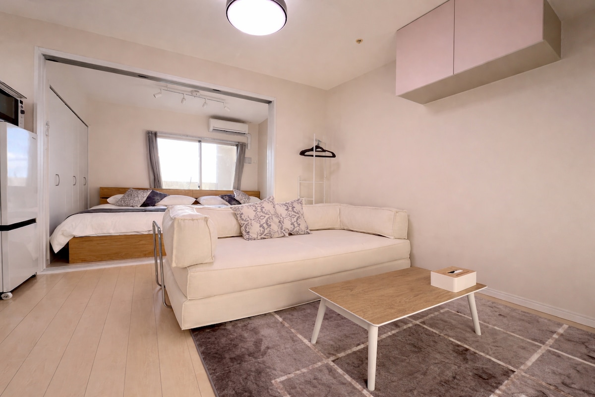 5 Minuten zu Fuß von der U-Bahn-Station Tenjin in Fukuoka. Ein renoviertes Apartment. 1 Doppelbett und 1 Schlafsofa.