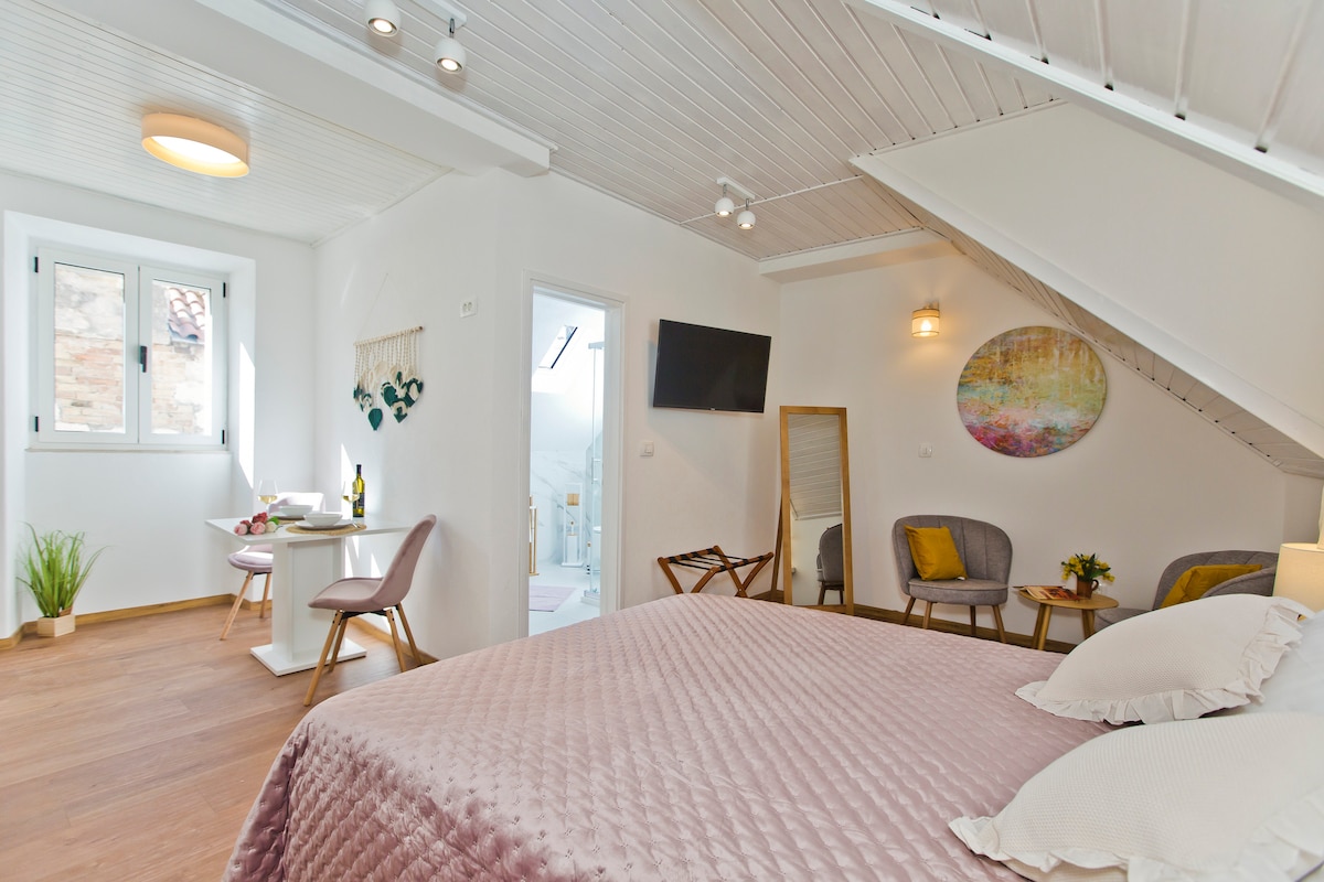 Historic loft in Hvar harbour, peaceful and gently elevated above the waterfront. Reached via a stone family house, inner courtyard and a large garden. Panoramic views over the harbour, old town, Fortica fortress and the historic theatre. Central location, yet slightly removed from the promenade noise. Ideal for couples who value calm, privacy and an authentic island atmosphere. The loft is reserved exclusively for its guests, ensuring a peaceful stay.