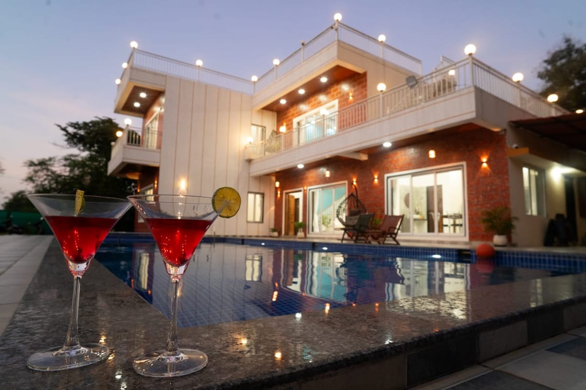 Eine luxuriöse Villa mit 2 Schlafzimmern und Blick auf den Pool in Dahanu in der Nähe des Strandes von Bordi. Die Villa verfügt über eine voll klimierte Innenausstattung, darunter ein gemütliches Wohnzimmer mit Plüschsofas und einem entspannenden Sitzbereich. Beide Schlafzimmer sind geräumig, ausgestattet mit Kingsize-Betten, Fernsehern und wunderschön gestalteten Badezimmern mit offenem Glasdach. Im Freien können Gäste einen großen Gemeinschaftspool, eine ruhige Liegewiese, einen Sitzbereich am Pool und einen gemeinsamen Essbereich genießen.