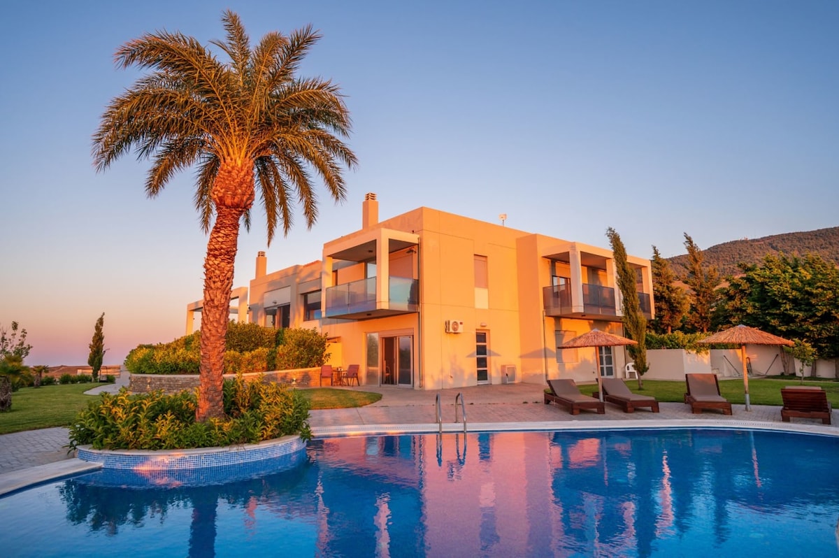 Lebe deinen Traumurlaub, indem du dich in einem privaten Gästehaus mit einem privaten riesigen Pool entspannst. Genieße einen ruhigen, atemberaubenden Blick auf den Sonnenuntergang in den Vororten von Kos.
