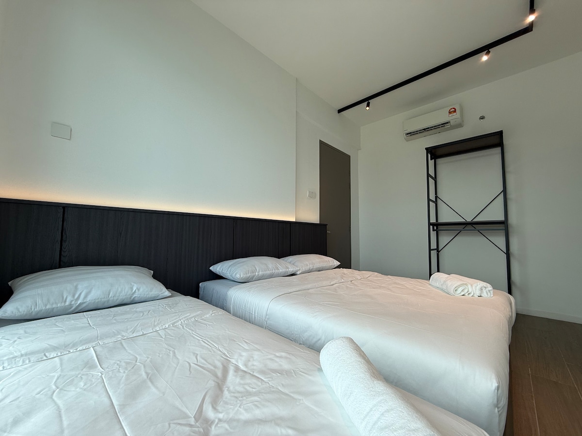 Stunning Sea view from the house. Chilling at the balcony. Swimming pool@level 6 Living Room, Queen Size bedroom, private sofa bed corner with curtains. Ensuite bathroom with hot and cold water shower. Large refrigerator with ice cube , mini kitchen with electric cooker, pot,plate,spoon,fork are available . Light cook at the kitchen. Filter water machine hot and warm. Please select 3 guest if you need single bed setting convert from sofa bed.
