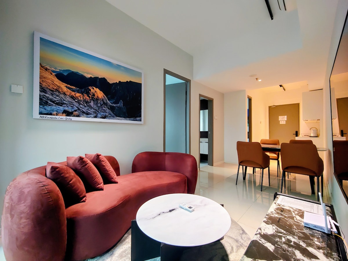 🍳Complimentary breakfast for 3 💡 For safety reasons, iron is not provided, but a garment steamer is available upon request 🌅 Corner unit on 15F with balcony views of bay, Mount Kinabalu & Likas 🛏️ 2 bedrooms: 1 Queen + 1 Single in one, 2 Singles in the other (sleeps 5) 🍳 Kitchenette with basic cookware & utensils 🍽️ Dining table for 4, cozy living area with flat‑screen TV ⚡ High‑speed WiFi, modern furnishings for comfort & convenience 🕌 Near KK landmarks, perfect for families or groups