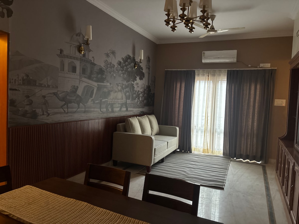 Welcome to The Terrace, a modern 2BHK in a peaceful, green & very safe area. Perfect for families, couples, and solos. The home is 30–35 minutes from the airport with easy access to Uber, Ola and nearby food joints. All major food delivery apps work smoothly, and we’re happy to share our top recommendations. You’re 20–25 minutes from GVK Mall, 2 minutes from the nearest hospital, right next to a lovely park for morning or evening strolls. Self-check-in for complete convenience during your stay.