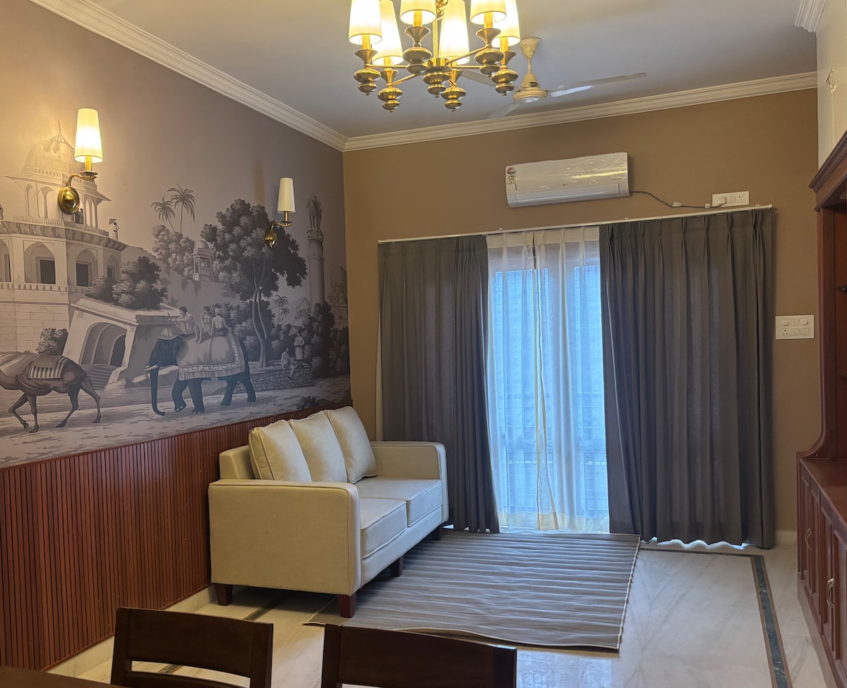 Stylish, fully furnished apartment perfect for Airbnb stays. Features a modern modular kitchen with refrigerator, cozy bedroom with double bed and wardrobe, clean tiled flooring, and warm lighting. Secure, comfortable, and thoughtfully designed—ideal for short or long stays for couples or working professionals.
