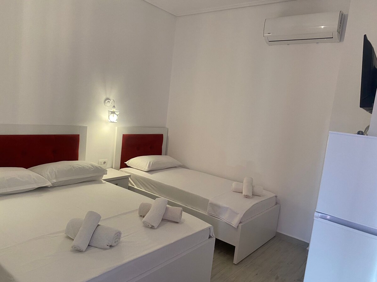 This room, located in a quiet neighborhood in Ksamil, is only 100 meters away from the center of shops and the bus station, providing easy access to all local services - Easy access to local restaurants and markets. This hostel is the perfect choice for any traveler looking for a comfortable and convenient stay in Ksamil.