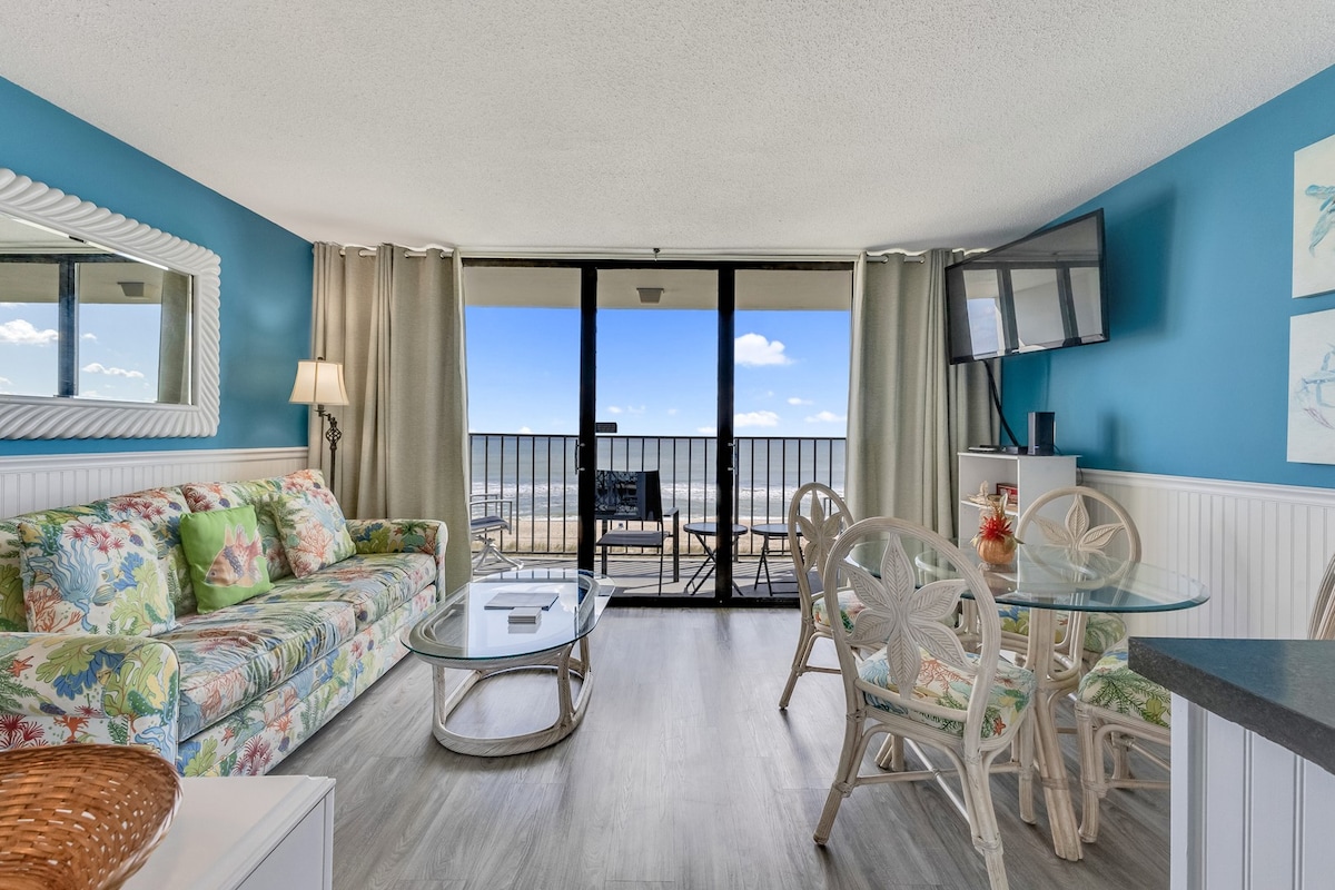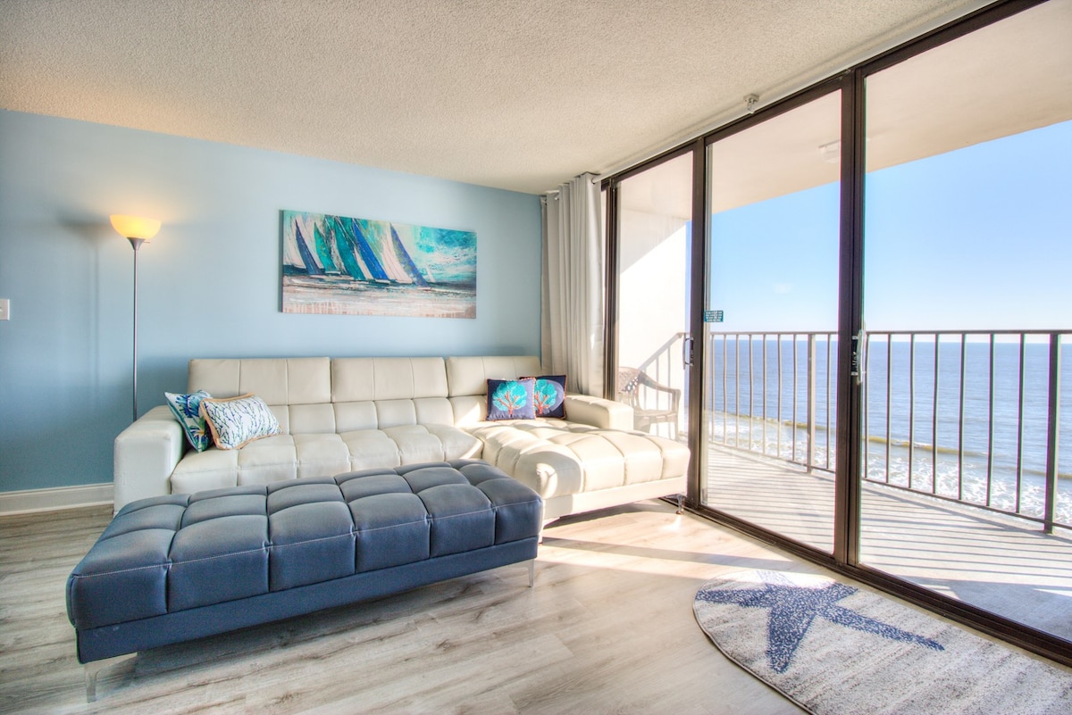 Oceanfront getaway, completely renovated, with spectacular views, and great on-site amenities! Why stay in a small hotel room when you can stay in a beautiful beachfront condo?? This 5th floor gem with elevators will quickly become your favorite vacation spot or romantic getaway. Exquisite decor that also captures the beach vibe!? You'll love welcoming the new day on the private balcony with your morning coffee and views of the stunning sunrise! Completely renovated with all new furnishings.