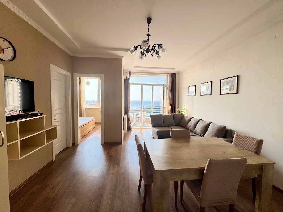 Entspanne dich an einem gemütlichen, ruhigen und stilvollen Ort direkt am Ufer des Schwarzen Meeres. Tolle Aussicht auf das Meer, die Berge und die Sonnenuntergänge! Zugang zum Strand, Pool, Cafés, Geschäften und Restaurants.