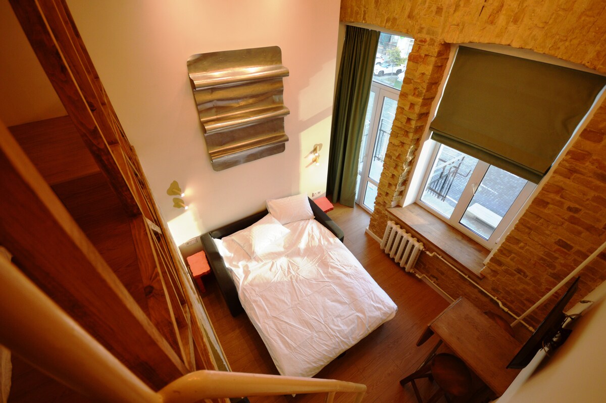 Gemütliches, kleines, schönes zweistöckiges Loft-Studio im 4. Stock eines historischen Gebäudes aus dem Jahr 1917. Das Gebäude mit Aufzug befindet sich im Zentrum von Kiew in der Nähe des Opernhauses. Die U-Bahn-Station „Universitet“ liegt nur 5 Gehminuten entfernt. Die Wohnungen sind Teil eines kleinen Apartment-Hotels mit 3 Zimmern. Im Inneren befindet sich ein Kingsize-Bett und im Zwischengeschoss gibt es hochwertige Matratzen für 3 Betten. Das Studio verfügt über eine eigene kleine Küche, ein eigenes Bad mit allem, was du brauchst, TV, Internet usw. Willkommen!