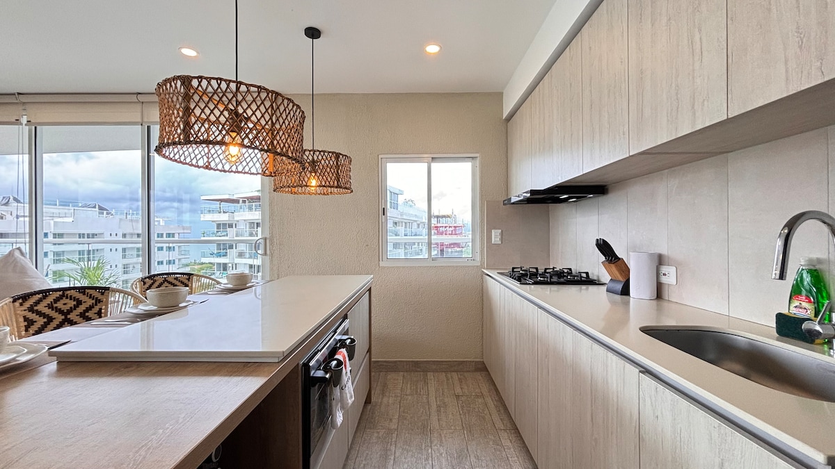 ✨ Welcome to your retreat in Cartagena: a luxury high-floor apartment facing the sea, with two private balconies and a 180° panoramic view of the Caribbean and the bay. Designed for your comfort, it features a modern living room with floor-to-ceiling windows, a fully equipped kitchen, fast WiFi, and digital check-in. Enjoy the infinity pool, poolside bar, and ocean-view gym. Located in Bocagrande, steps from the beach and minutes from the Walled City. 🌊🌴