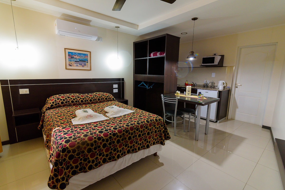 Disfrutá de este alojamiento tranquilo y céntrico en Paraná, con vista al río. Cuenta con un dormitorio con cama matrimonial, placar y aire acondicionado frío/calor. Living con cocina integrada y totalmente equipada. TV de 32" con Chromecast para utilizar plataformas de streaming. Sillón cama (apto para una persona adulta o dos menores) Baño completo Ropa de cama y ropa blanca. Desayuno seco. Vajilla y utensilios para 4 personas. Cochera con costo adicional (requiere reserva anticipada)