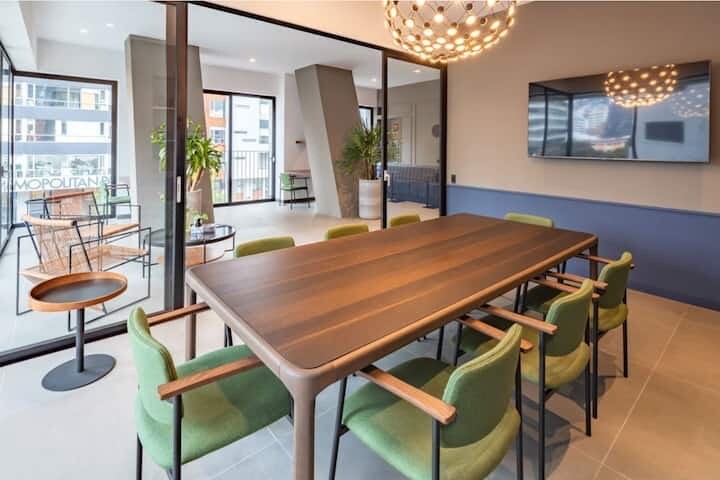 Spectacular suite located just across La Carolina Park. Imagine the view from the 17th floor, whether you're relaxing on the sofa or in bed. Features a fully equipped kitchen, fast internet, and you'll feel right at home. Easy walking access to the Subway, Mall El Jardín, and CCI. Pool - Sauna - Jacuzzi Well-equipped gym Incredible rooftop 60” Smart TV - Netflix Induction cooktop Refrigerator Laundry room inside the apartment Microwave Blackout curtains Clothes iron