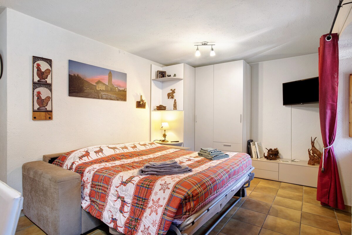 Monolocale, con letto matrimoniale a scomparsa verticale, ideale per due persone, situato al 1° piano, in posizione strategica vicinissimo al centro storico, con la possibilità di parcheggio gratuito nelle vicinanze o a pagamento nel cortile interno. L'appartamento è dotato di ogni comfort, perfetto sia per visitare la città che per raggiungere le mete turistiche della regione. La cabinovia per Pila è raggiungibile a piedi in 10 minuti (1 km) così come la stazione ferroviaria e dei pullman.