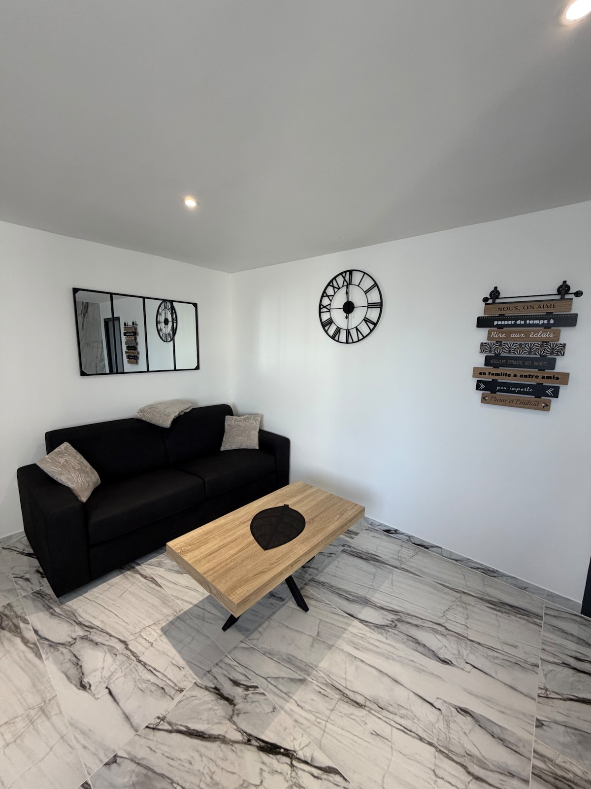 Logement meublé,au calme et lumineux. Réalisation neuve à l'étage de notre maison principale. Son accès par un escalier extérieur,vous garantie une indépendance totale. Vous y trouverez : Une grande pièce à vivre avec un canapé fixe,un téléviseur. Un coin cuisine équipé plaque induction, micro onde , hotte, évier et réfrigérateur.Cafetière+bouilloire. Une salle d'eau + wc, ainsi qu'une chambre avec lit 2 places. Drap,housse couette, oreillers traversin,serviettes de toilette fournis