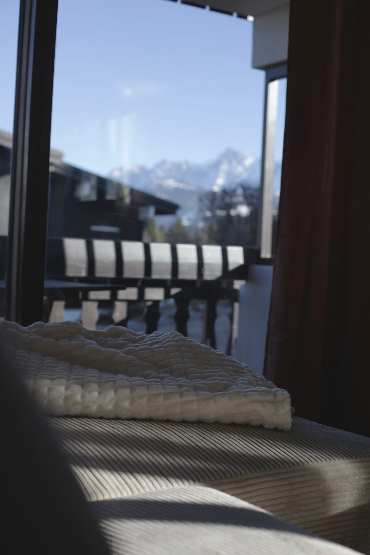 Weißes Schmuckkästchen am Fuße der Pisten mit Blick auf den Mont-Blanc