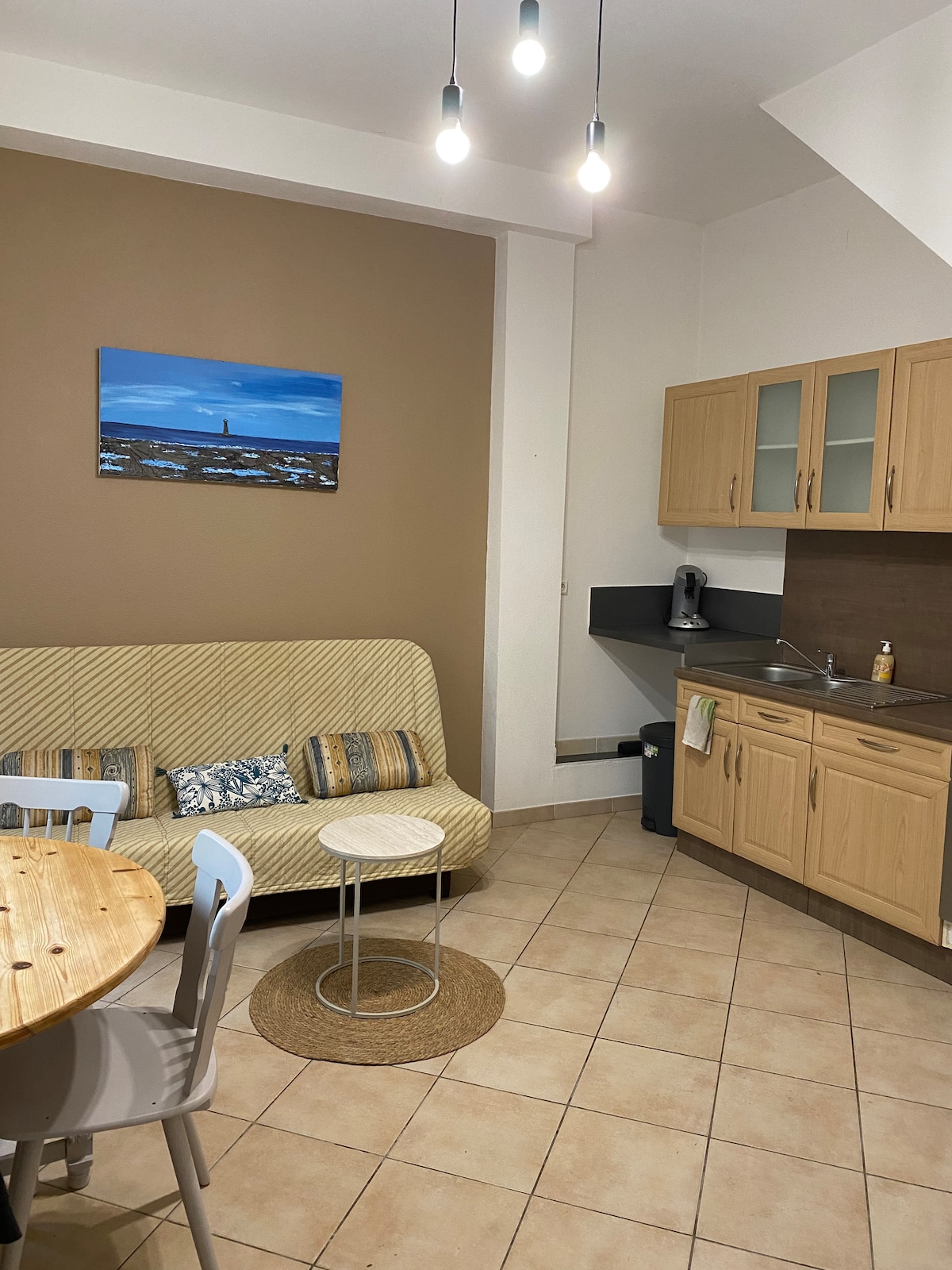 Eine familiäre Oase am Strand, 54 m ², hell und klimatisiert. Dieses Haus ist perfekt für einen erholsamen oder professionellen Aufenthalt. Komplett renoviert und geschmackvoll eingerichtet, bietet es Platz für 4 Personen. Bettwäsche und Handtücher in Hotelqualität, voll ausgestattet und funktional, alles, was du tun musst, ist deine Koffer ablegen. Bettwäsche, TV-WLAN-Box und geschlossener Parkplatz.
