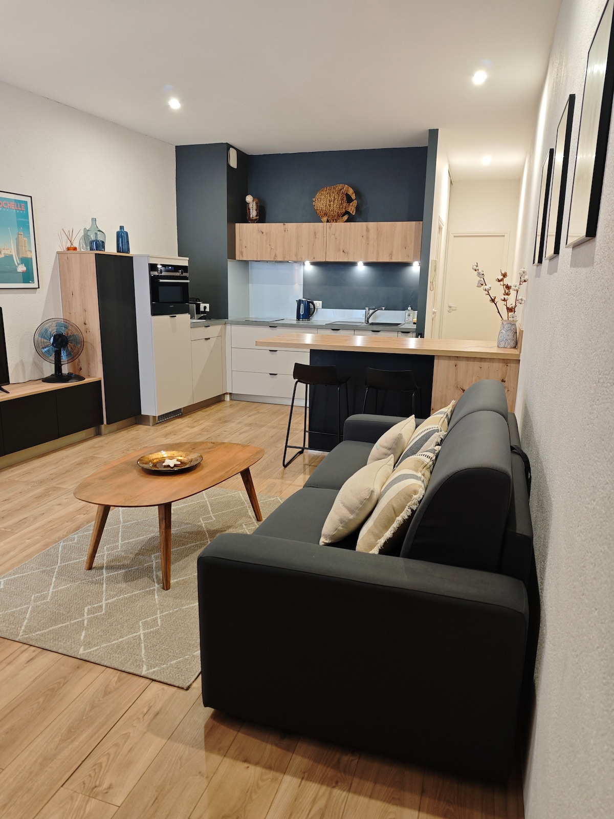 Détendez-vous dans ce logement de "standing"(60m²) calme, confortable, élégant et climatisé pouvant accueillir 4 personnes. Cet appartement propose des équipements haute gamme, 2 chambres, literie de 160 et TV connectées. Doté d'une décoration soignée. Terrasse ensoleillée (20m²). " Parking Privé " Situé dans un quartier résidentiel à 10 min du centre ville de La Rochelle, de l'aéroport, de l'île de Ré et à 150m d'un carrefour-city, boulangerie, transport en commun, cabinet médical et pharmacie.