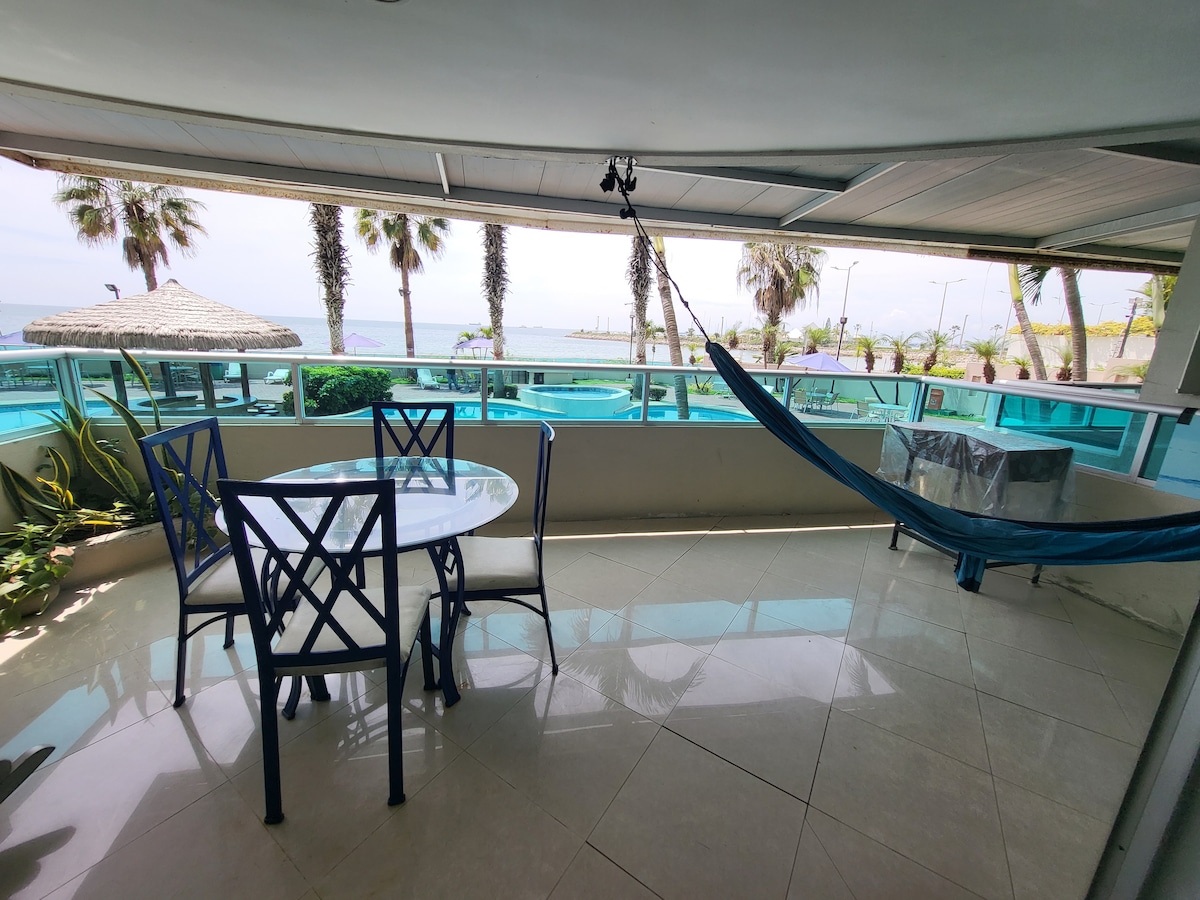 Wohnung im Hotel Colon de Salinas. - Zimmer mit 75-Zoll-Smart-TV und Netflix - 2 Badezimmer mit Dusche - Balkon mit direktem Blick auf das Meer - Wohnzimmer - Küche - Kaffee und Kaffeemaschine - Privater Parkplatz - 24-Stunden-Sicherheitsdienst - 3 Pools - Direkt am Anfang von El Malecón - Hotelservice (Restaurant, Spa, Fitnessraum, Zimmerservice). Diese Dienstleistungen sind unabhängig von der Wohnung. *Es sind nur 2 Gäste pro Nacht erlaubt* *Bitte seien Sie vorsichtig mit der Hängematte*