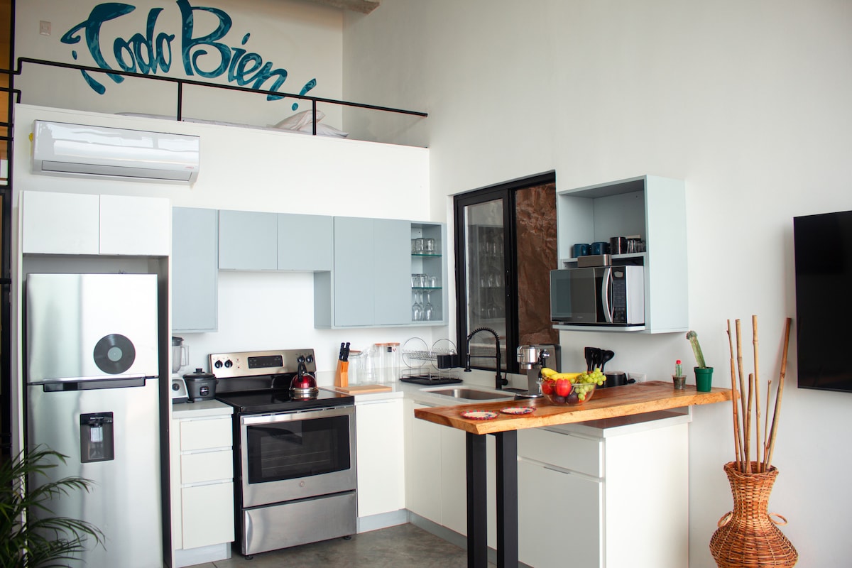 Dieses offene Loft in El Zonte bietet stilvolle Abgeschiedenheit, nur wenige Schritte von der Brandung entfernt. Mit schnellem WLAN ist es perfekt für mobiles Arbeiten, während die geräumige Terrasse einen großartigen Ort zum Entspannen bietet. Für größere Gruppen kannst du das darunter liegende „Shiva Surf Loft“ für zusätzlichen Platz buchen. Das Loft verfügt über ein Kingsize-Bett (oder zwei Einzelbetten) mit der Option für ein drittes Bett, ideal für Paare oder Freunde. Es befindet sich im zweiten Stock und verfügt über eine Klimaanlage, eine voll ausgestattete Küche, ein Badezimmer, einen Schreibtisch und eine gemütliche Couch.