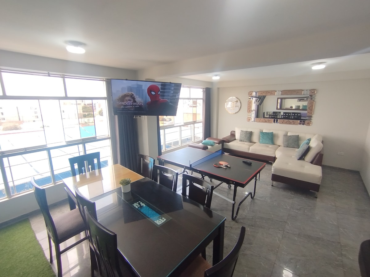 Schöner Ort im 4. Stock mit Zugang zur Terrasse, 100 m vom Meer entfernt. Ein zentraler, fröhlicher und jugendlicher Ort, belüftet und beleuchtet. Es verfügt über ein Schlafzimmer mit einem 2-Sitzer-Bett, ein Esszimmer und eine Küche. Alles möbliert und implementiert, Sofa, Fernseher, Kühlschrank, Mikrowelle, Küchenutensilien. Dusche mit Warmwasser. Gemeinsam genutzte Waschmaschine. Es liegt in der Nähe von Restaurants, Weingütern, Apotheken, Surfschulen und dem Chan Chan Museum. Genieße Totora-Reiten, probiere Meeresfrüchte und Meeresfrüchte.