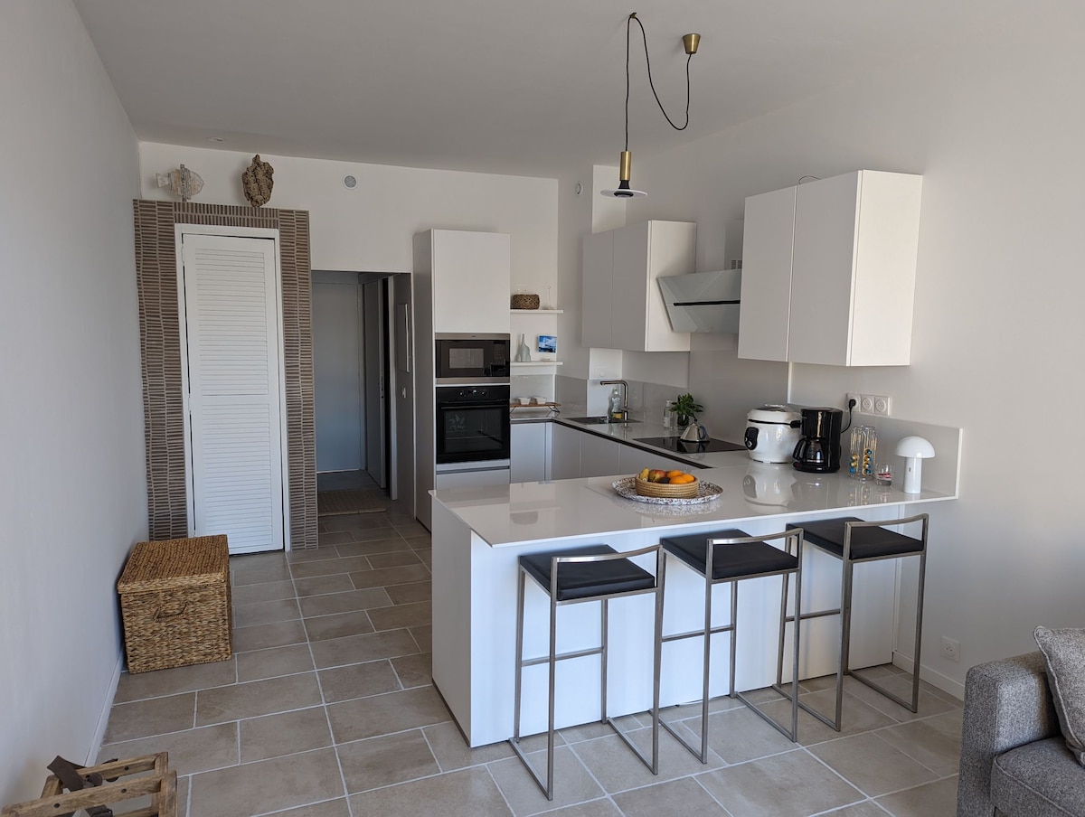 Hervorragende Wohnung im Loft-Stil von ca. 40 m2 mit integrierter Küche, Kühlschrank und Waschmaschine, separatem WC, Bett 160 cm mit hohem Komfort und Schlafsofa, mit Blick auf den schönsten Strand von Bandol. Außergewöhnlicher Meerblick, auf den Strand von Renécros, Hafen und Stadtzentrum zu Fuß, privater Parkplatz mit elektrischer AUFLADESTATION für Auto, ganz neu.