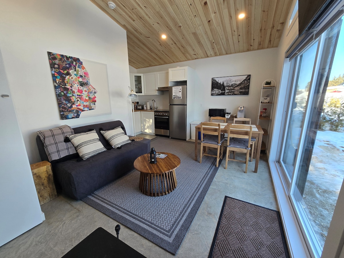 Profitez de l'atmosphère stylisé de ce logement au centre de tout. Le Havre, ce petit chalet 4 saisons situé entre La Malbaie et Baie-St-Paul, au cœur des montagnes de Charlevoix. Lit Queen, canapé-lit, poêle à bois, plancher chauffant, climatisation, foyer extérieur et accès aux spas communs. Idéal pour couples ou petites familles. Proche des sentiers, motoneige vtt et randonnées. Animaux acceptés ($).-vous et relaxez dans ce logement tranquille et élégant.