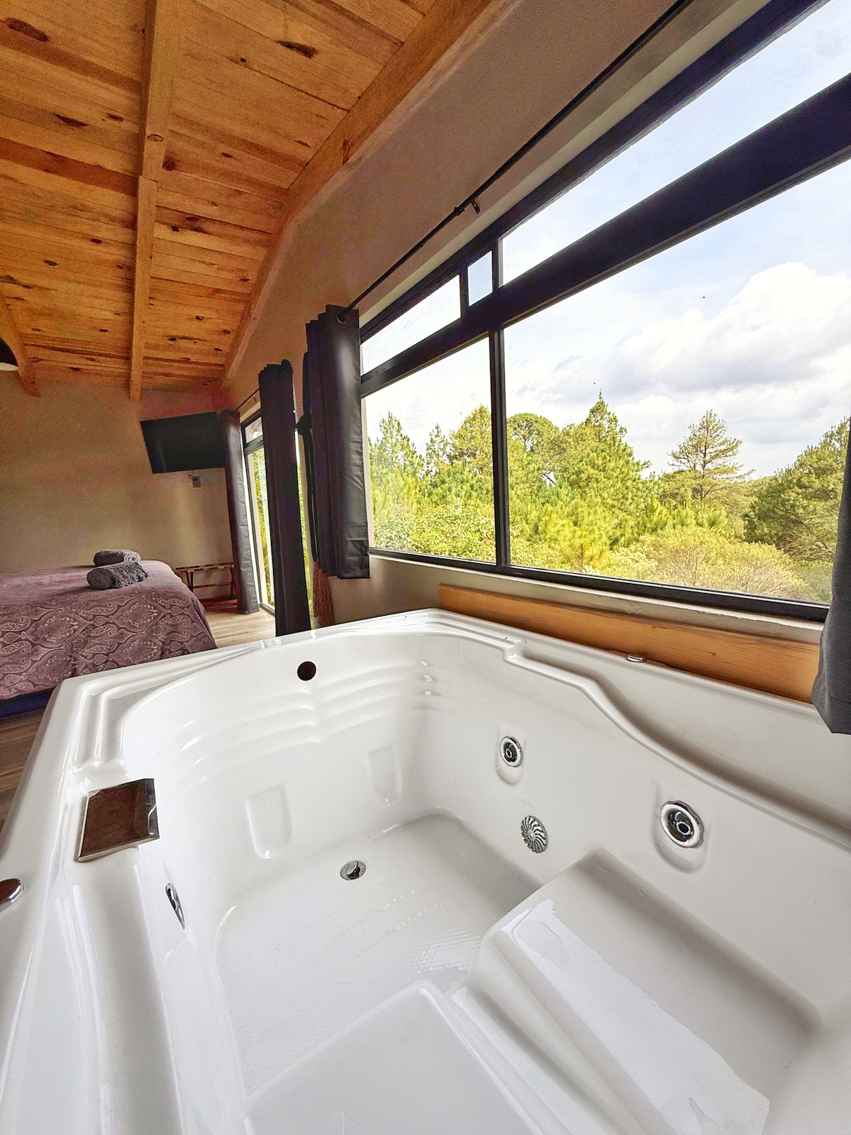 Kleine und gemütliche Hütte mit Whirlpool. Ein romantischer und privater Raum, der geschaffen wurde, um sich mit seinem Partner zu entspannen. Diese schöne und exklusive Unterkunft befindet sich in einer privaten Wohnsiedlung namens „Paso del Ciervo“, nur 12 Minuten vom Dorf Mazamitla entfernt.
